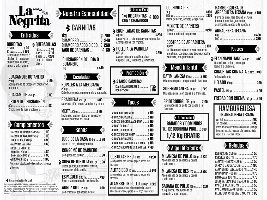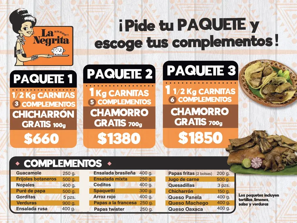 En la Negrita usted puede degustar nuestra gran variedad de platillos mexicanos como, "Las mejores Carnitas del Mundo", contando con productos tales como Chicharron, Gorditas, Arrachera, Mixiotes de Carnero acompañados de deliciosas salsas para que usted pueda disfrutar de la diversidad de todos nuestros productos.